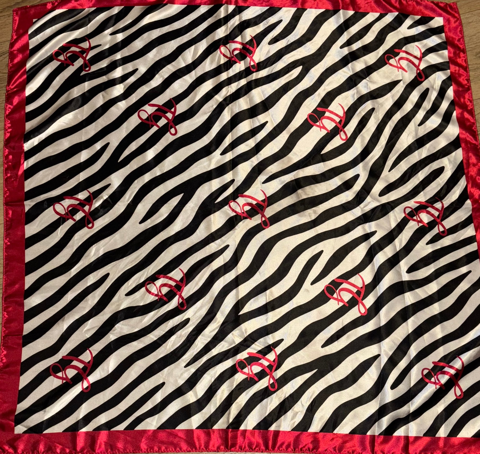 Silky zebra-print scarf featuring the TG logo and trim in raspberry pink.